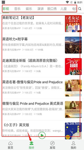 5、在“我听”中可以找到多种教材资源;