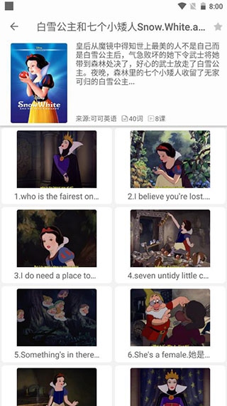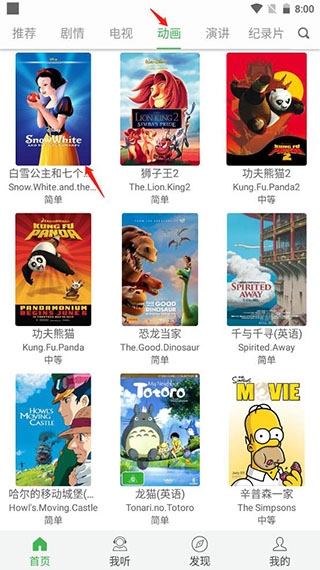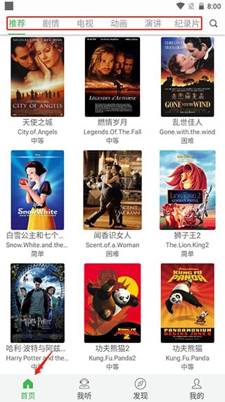 1、打开应用后,首页展示了许多经典的美国电影,你可以在其中选择不同类型的英语学习内容,如剧情、电视节目、动画、演讲和纪录片等;